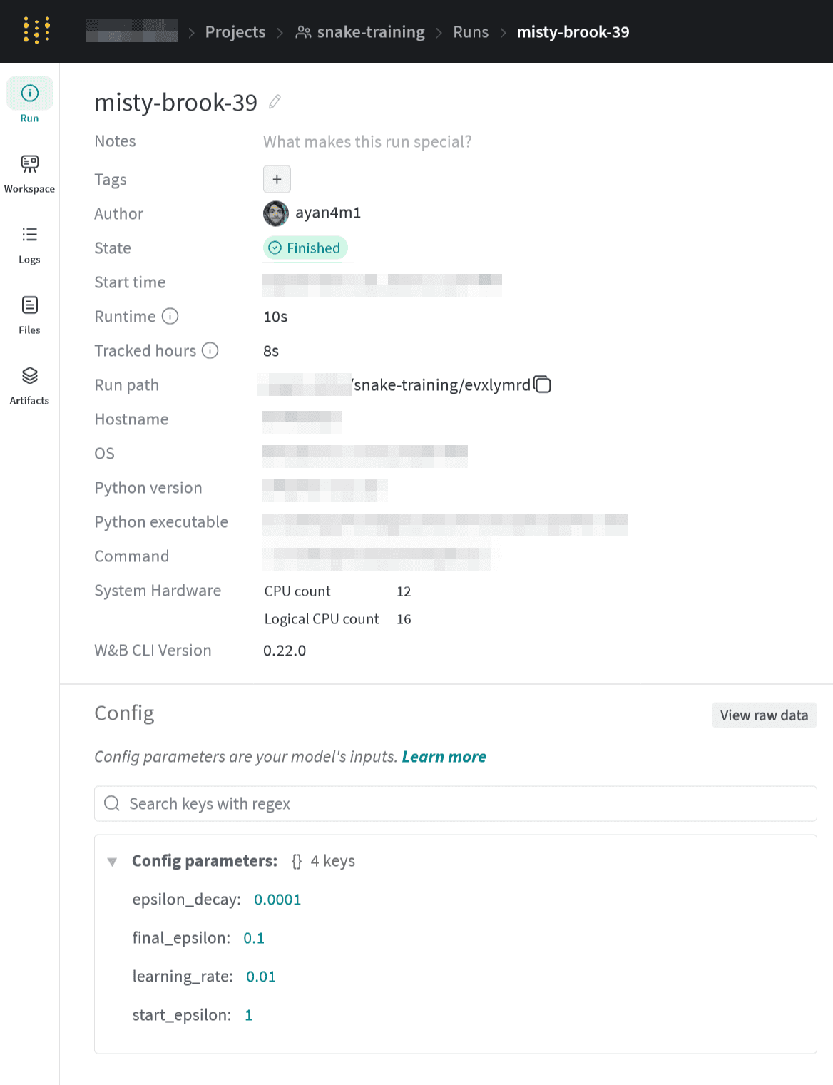 fields and changing them as our code evolves, you can keep track of exactly what piece of code was being used to generate a given run. If you click on a run in W&B, then click the "Run" tab on the left-hand menu, you will see the config values you logged at init